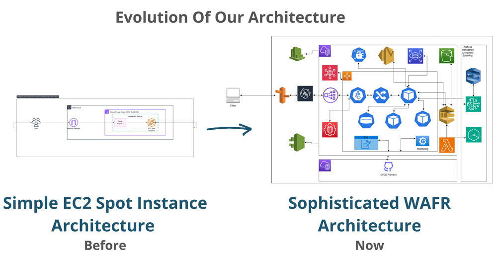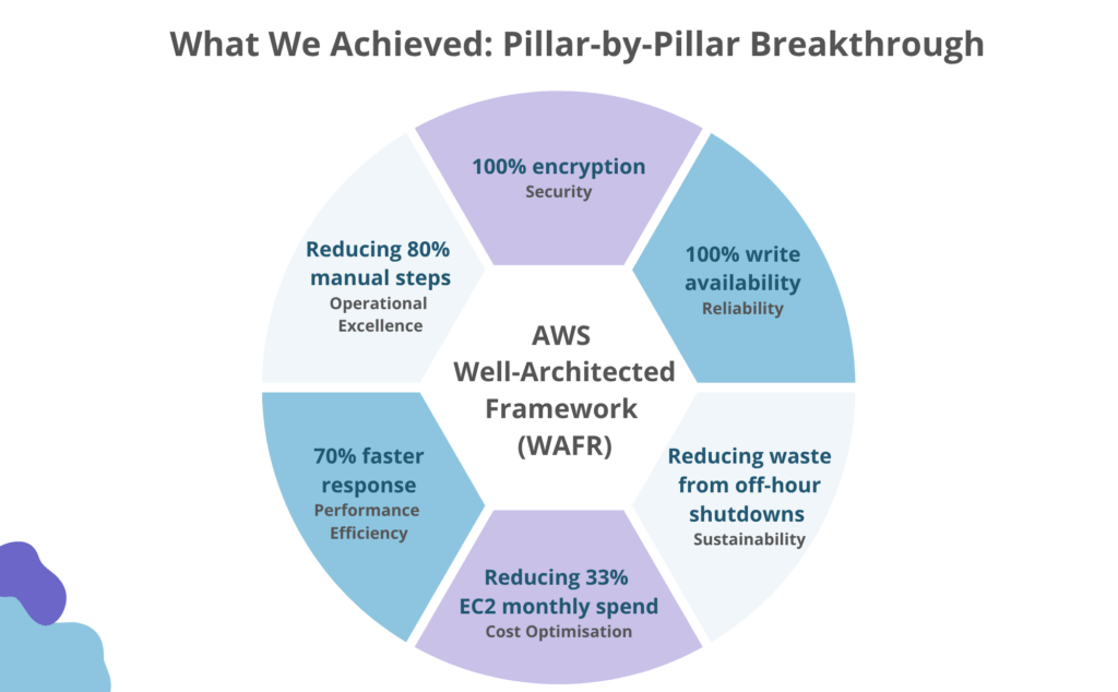 Today, we have been running in four distinct and interconnected environments across two continents. This wasn’t just about getting bigger; it’s also about committing to the best practices in cloud computing. To guide us through this massive evolution, we adopted the AWS Well-Architected Framework (WAFR), which provided us with six pillars to focus on: