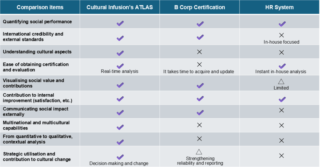 Through its sophisticated methodology and definition of cultural diversity, Atlas helps companies understand and integrate social aspects into their strategies. This approach enables organisations to go beyond mere reporting and certification to guide decision-making, shape actions, and support meaningful culture change. For example, companies can identify areas of strength and weakness in inclusion, and evaluate the impact of their efforts in real time. While traditional methods measure social impact unevenly, Atlas gives companies the high-quality data and insights necessary to understand, act, and improve their socially responsible practices, bridging the gap between numbers and culture and making social performance a strategic asset rather than just a compliance requirement.