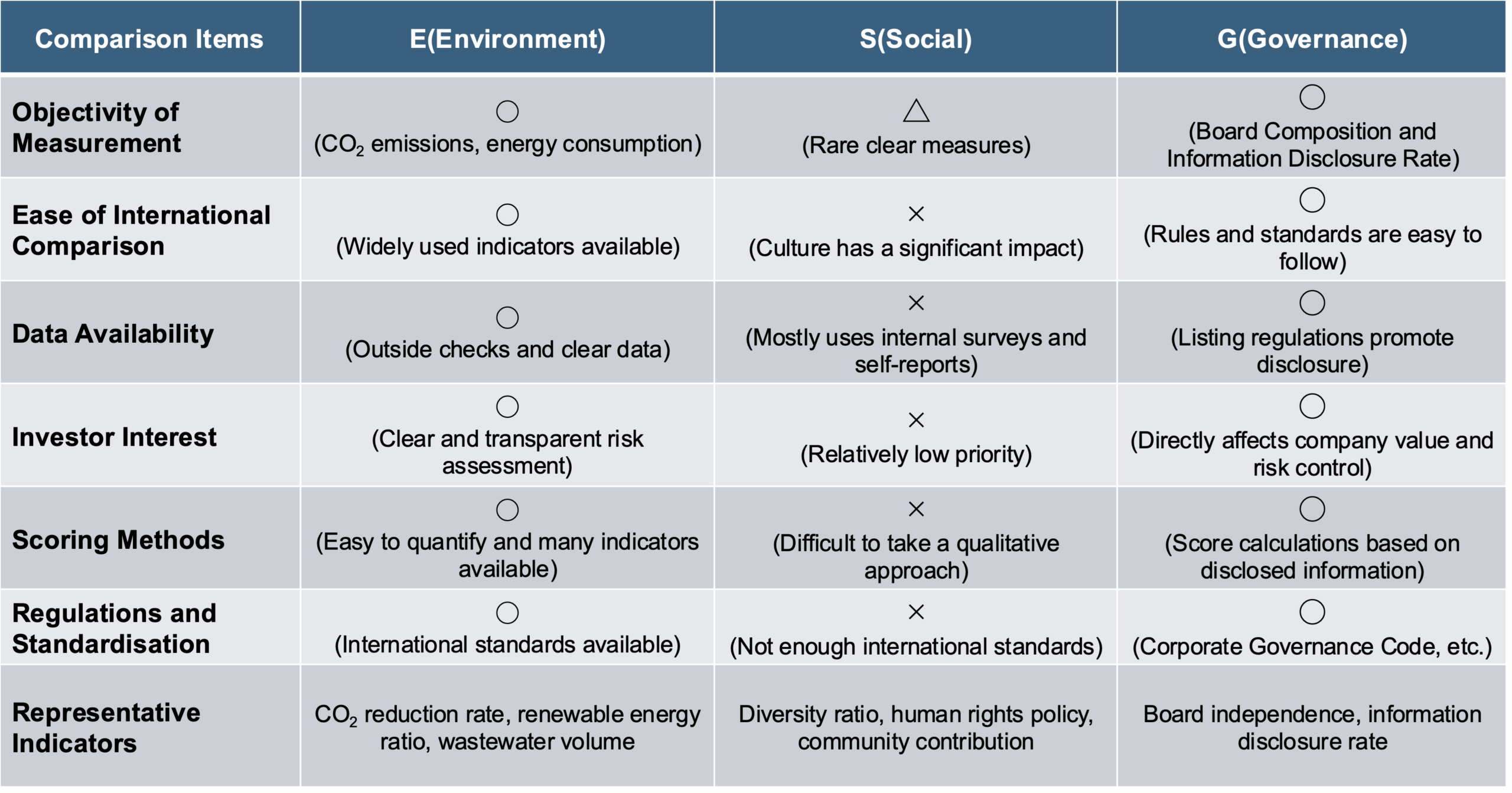 ESG evaluates corporate activities from the three perspectives of environment, society and governance. Environmental issues, such as carbon emissions, energy use, and renewable energy adoption, are relatively easy to measure. Before ESG, companies had limited understanding of their environmental impact and few concrete measures. Since ESG, companies track emissions reduction and resource efficiency, improving regulatory compliance and brand value.