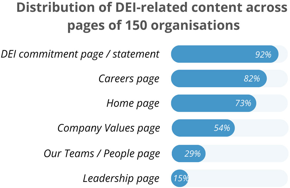 - Blind Spots: DEI-relevant content was much less visible on the Leadership page (15%) and Our Teams / People page (29%). This indicates that while organisations talk about these crucial values, they might not always be demonstrating who embodies these values.