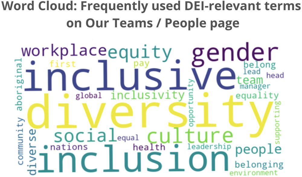 Only 29% of organisations include diversity or related terms on the Our Teams/Our People pages. When they do, the most common terms and phrases were “diversity”, “inclusive culture”, “social inclusion”, and “inclusive workplace”. Other mentions included “gender pay equity”, “equal opportunity” and “belonging”. This suggests a sense of general awareness, but not, perhaps, a consistent effort to connect diversity initiatives directly to team members.